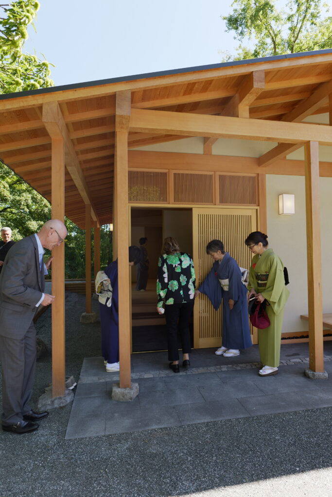この場所は単なる建物ではなく、多くの方々が自然の美しさや季節の移ろいを感じ、新たな出会いを育んでくれることを心から願っています。茶室に入る前に茶庭で心を清め、世俗を離れた特別な空間で一服を楽しんでいただきたい」と述べた。 その後テープカットが行われ、ゲストたちは完成したばかりの畳の香りが漂う茶室へと招かれた。茶会では裏千家淡交会出張所駐在講師のキース・スナイダー氏が茶道の説明を行い、ビクトリア裏千家淡交会の三戸和子さんがお茶を点て、ゲストは和菓子と抹茶を堪能した。この茶室の建造には、地元のダグラスファーを使用し、日本の伝統的な構法によって作られた。八畳の広間の茶室は全ての場所から庭を眺められるデザインになっており、雪見障子と襖を閉じると外部から遮断された異空間を演出している。柱、梁、垂木、軒、縁側には無節のダグラスファー、雪見障子と床材は檜を、水屋や地袋にはカナディアンメープルと杉、そして床の間にはブラックウォールナットを使用している。畳は京畳、襖には掛川和紙を用いており、天井には編んだ蒲(がま)を設え、壁は聚楽塗りで仕上げられた。玄関には地元産の玄武岩と檜の格子ドア、待合にはレッドオークが用いられ、各素材の特長を最大限に活かした作りとなっている。