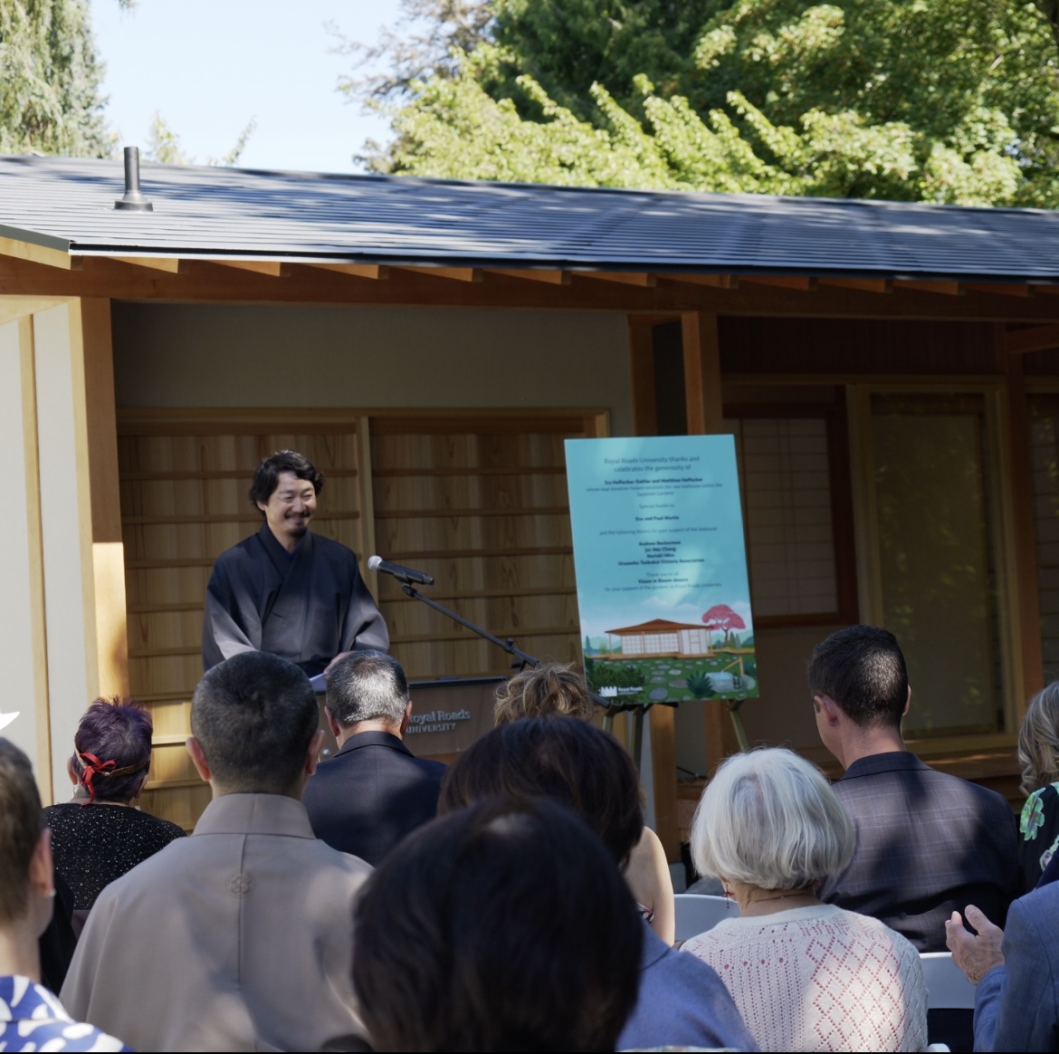 Royal Roads University 日本庭園 茶室プレオープンを開催 先月号で紹介した、Royal Roads University (2005 Sooke Road, Victoria, BC)の100年以上の歴史を持つ美しい日本庭園の大規模な再生計画で茶室が完成し、8月28日にプレオープンが行われた。